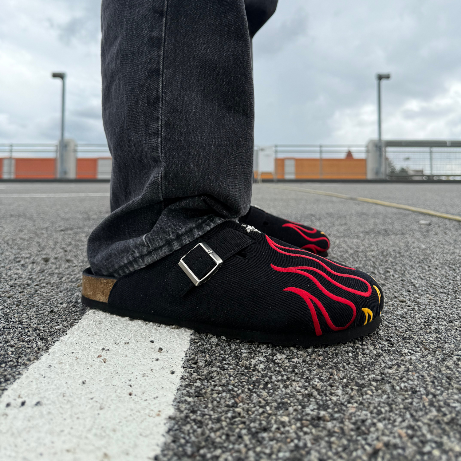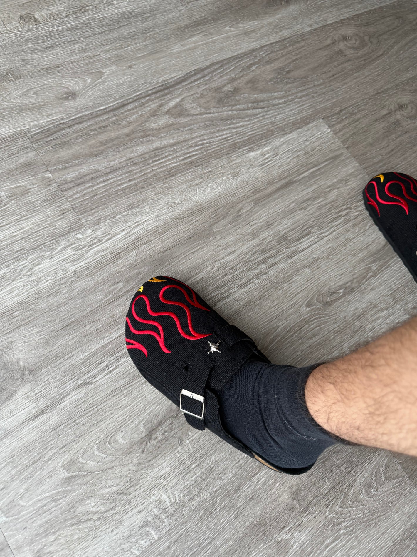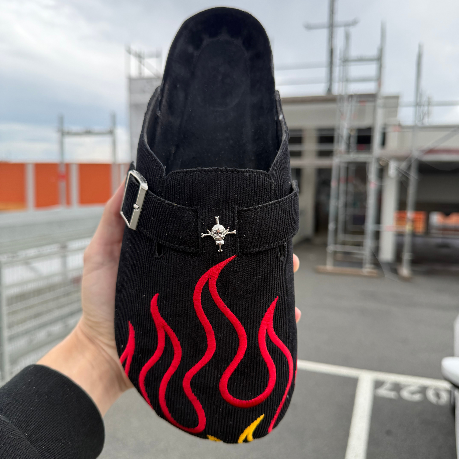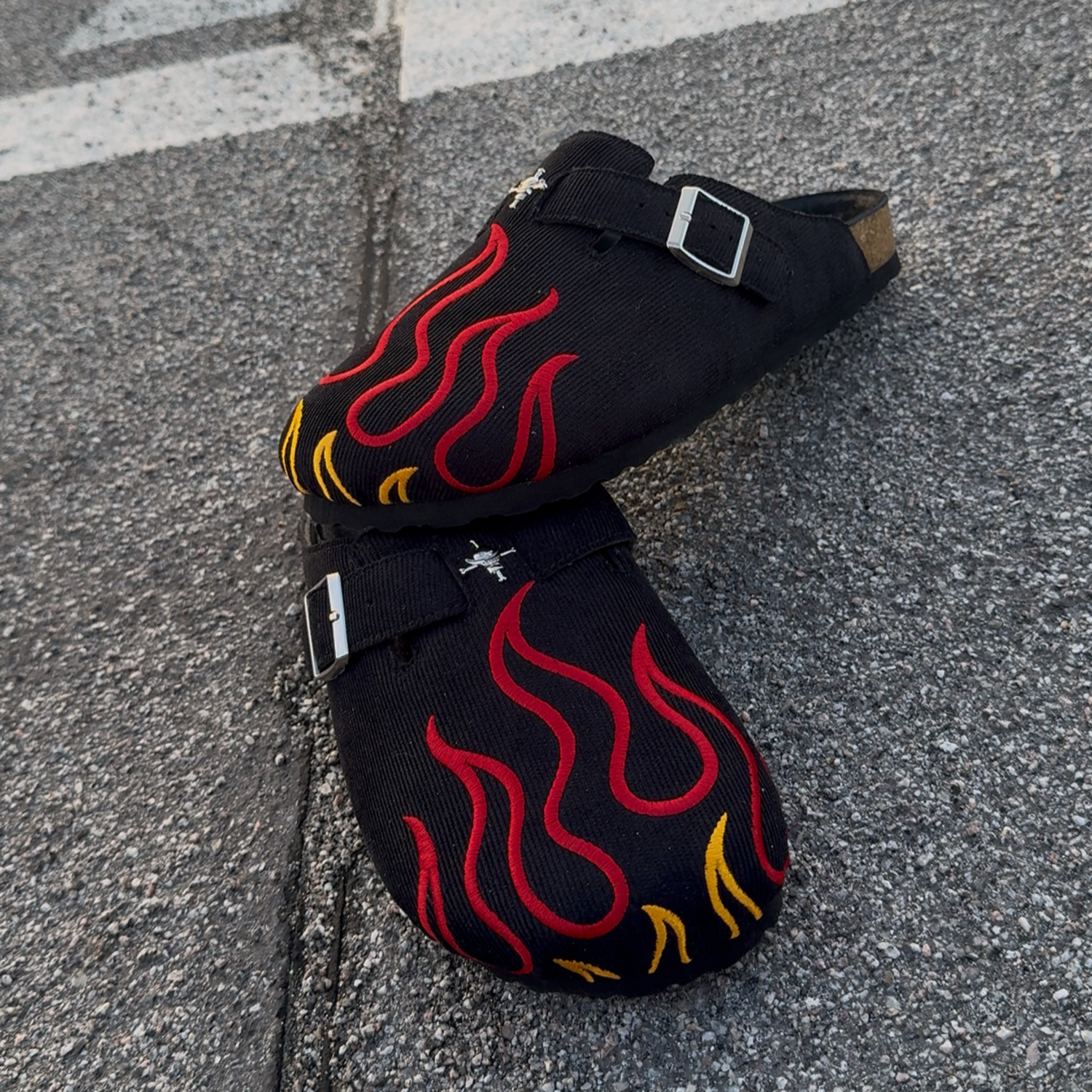 Crafted for those who carry the will of fire, these clogs channel Ace’s fearless spirit. Black canvas ignites with red-and-yellow flame embroidery, while a silver buckle and skull emblem echo his iconic look. Grounded by a cork sole, they’re a sleek nod to adventure—subtle enough for the streets, powerful enough to honor a legend.